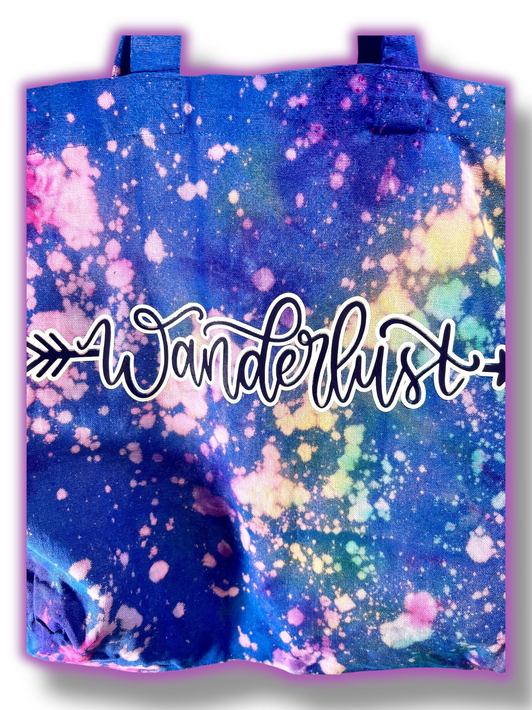 • Color(s): Blue tote with splattered bleach, then tie-dyed green, yellow, pink