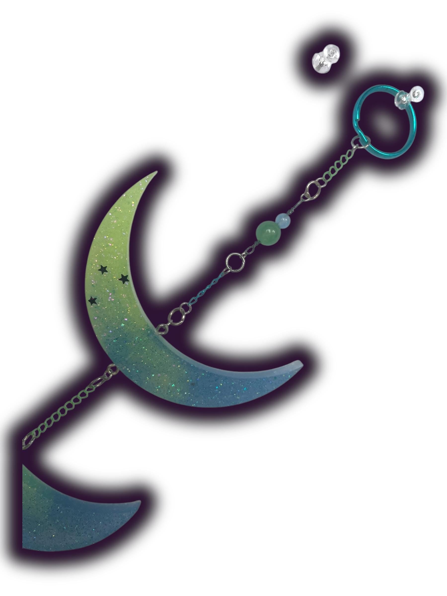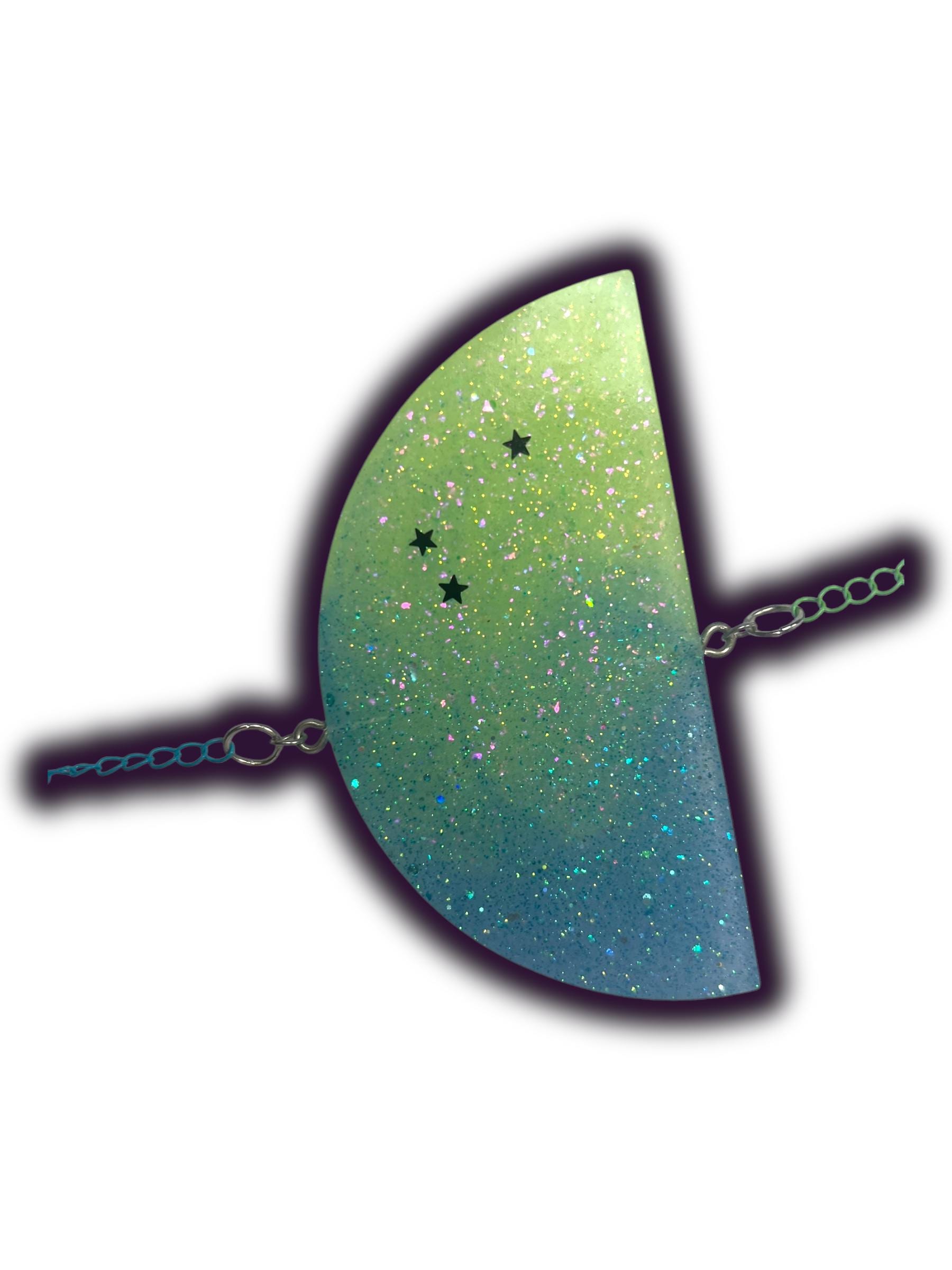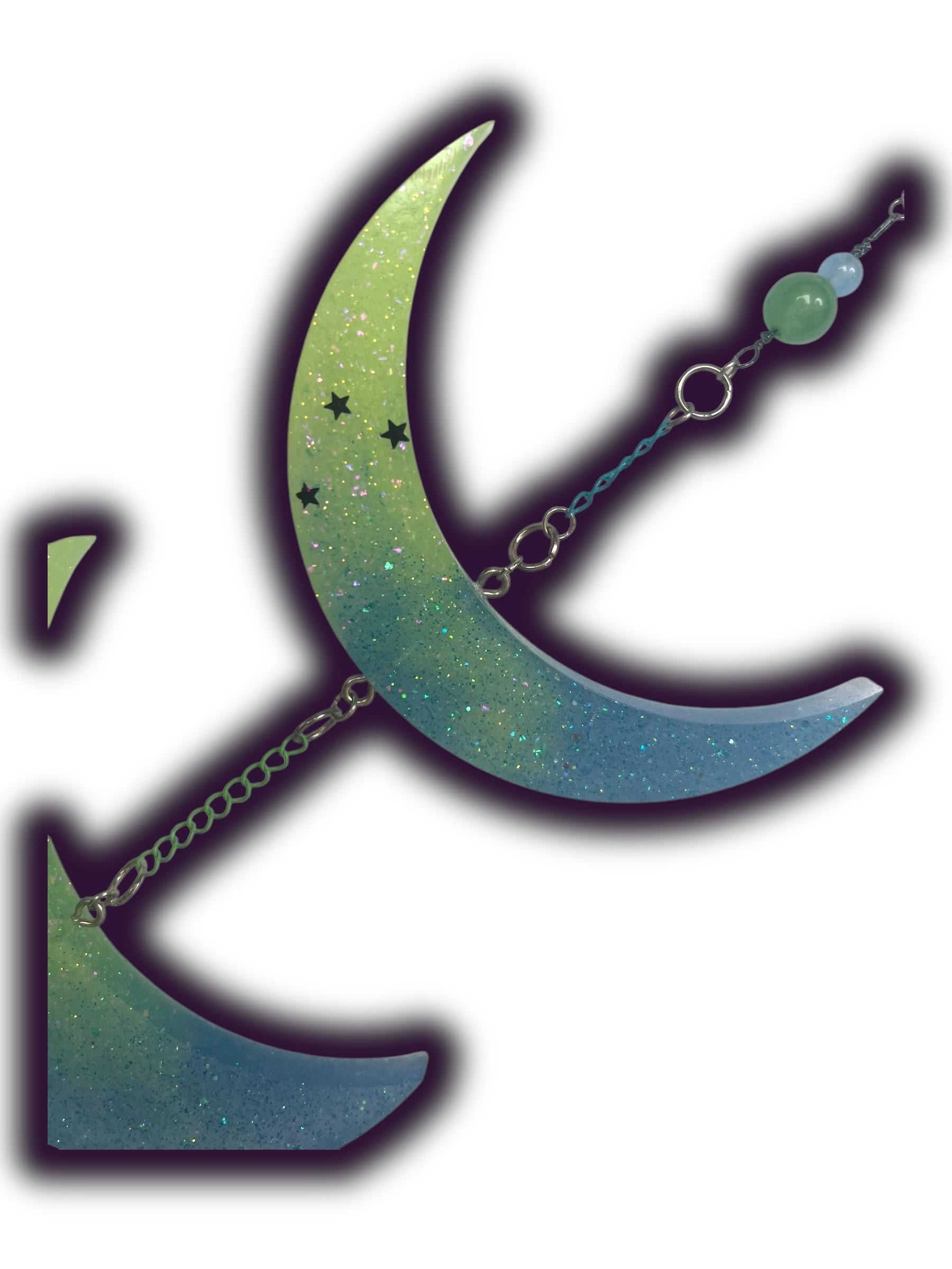 Ocean-witch meets cosmic alchemist. This one pulses with electric tides—greens & blues colliding in a stardust storm, anchored by crystals that don’t just vibe—they vibrate.