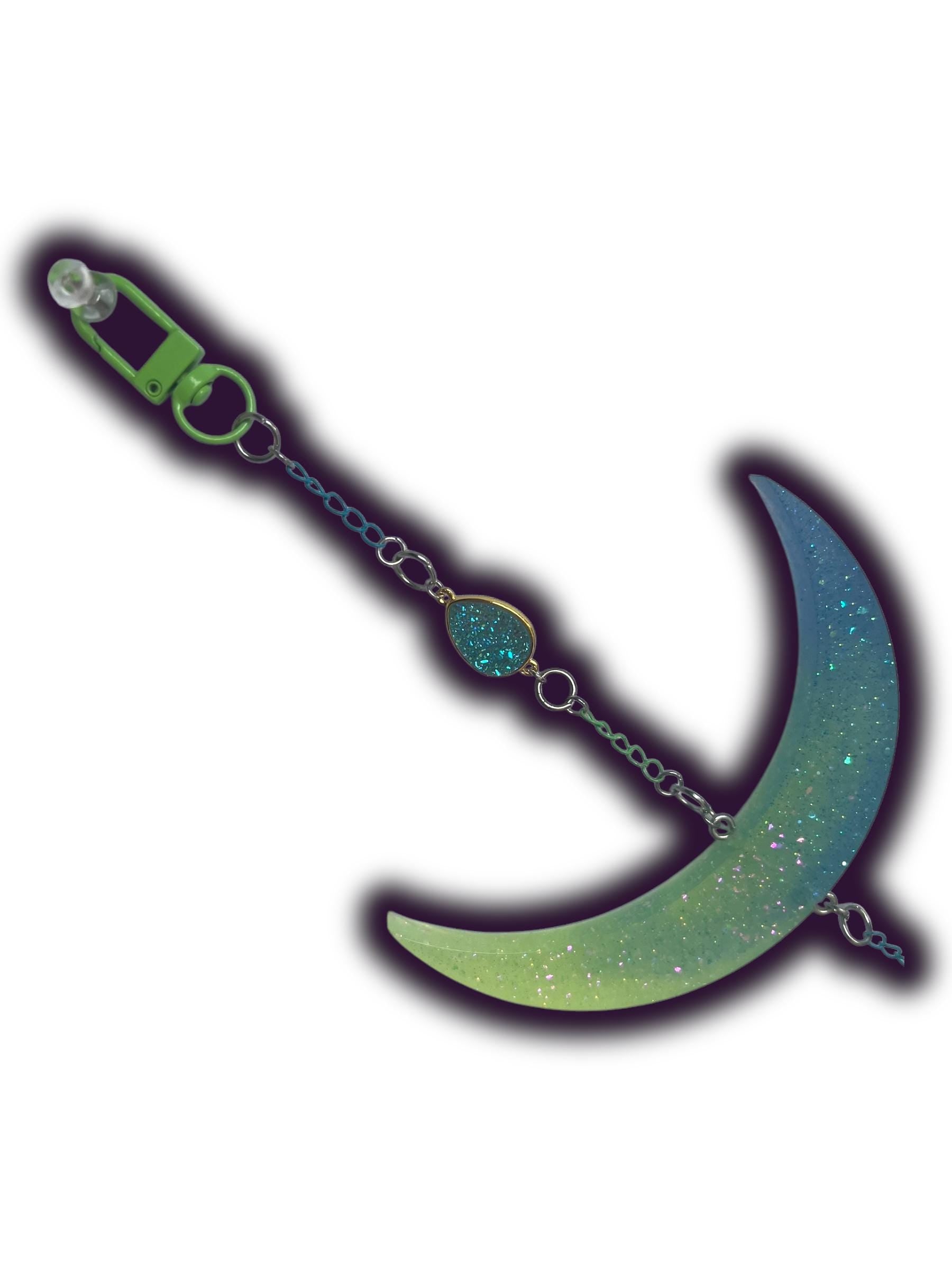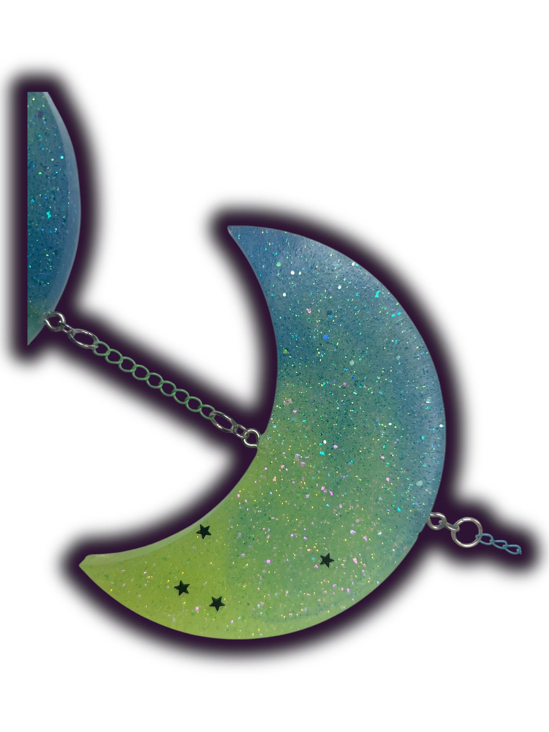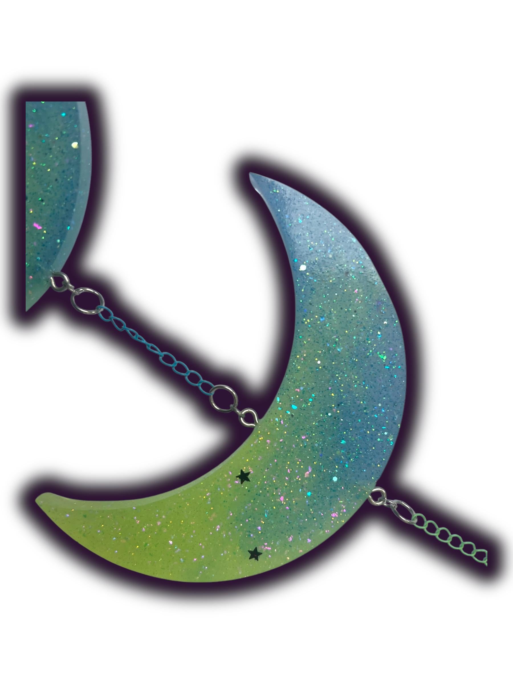 Ocean-witch meets cosmic alchemist. This one pulses with electric tides—greens & blues colliding in a stardust storm, anchored by crystals that don’t just vibe—they vibrate.