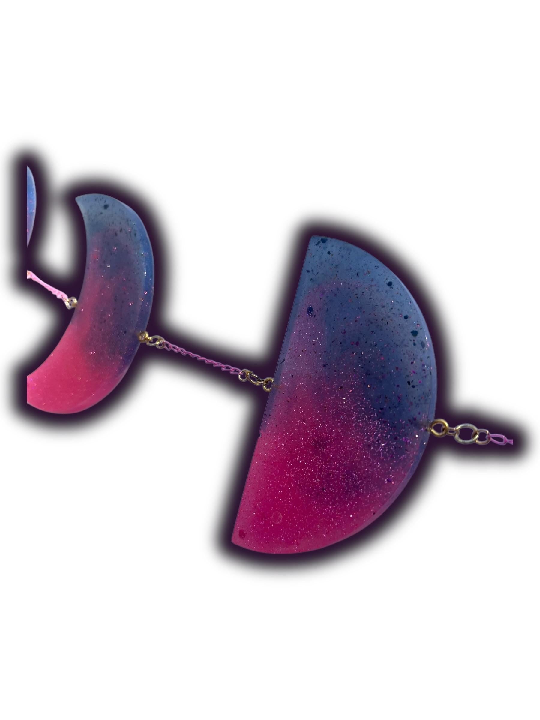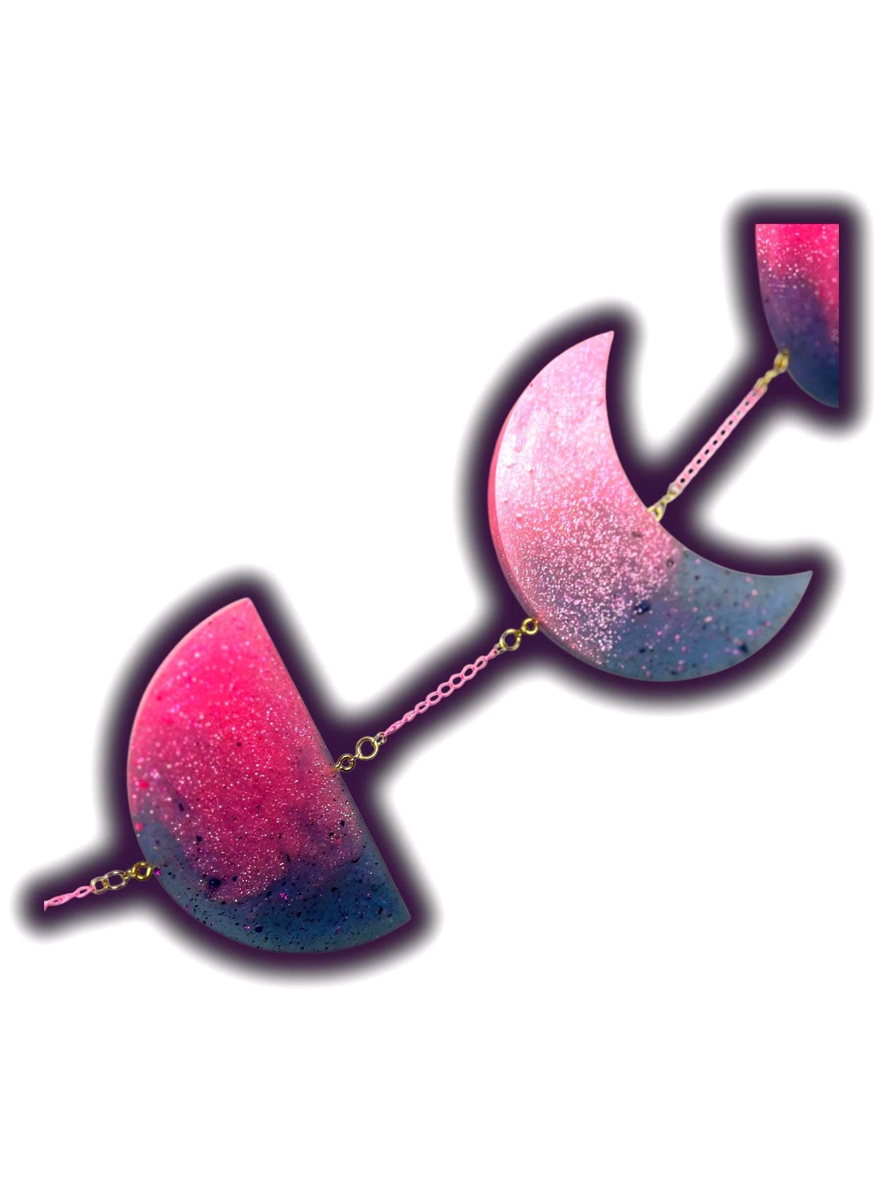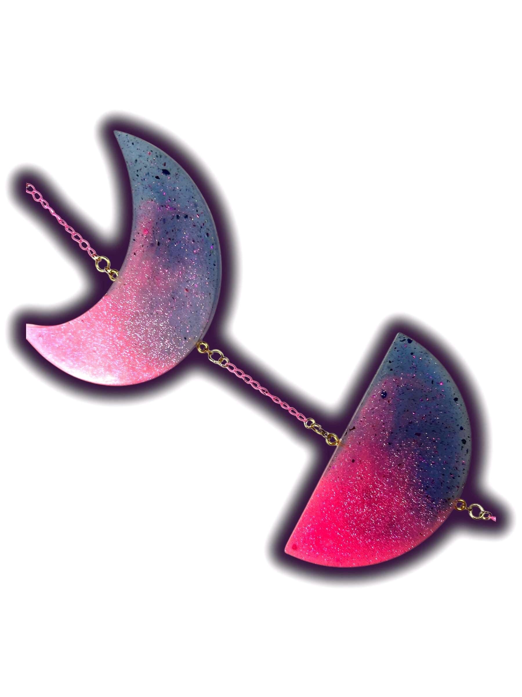 • Materials & Finish: Light pink chain + clips, gold accents, pink & blue galaxy cabochon